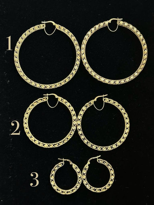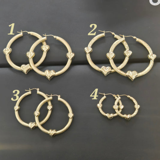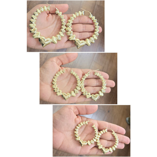10k Yellow Gold Hoops with Heart Design, All Around Hearts, Love Hoops, Clip on Earrings, Textured Graduated Heart Hoops, Bamboo Heart Hoops
