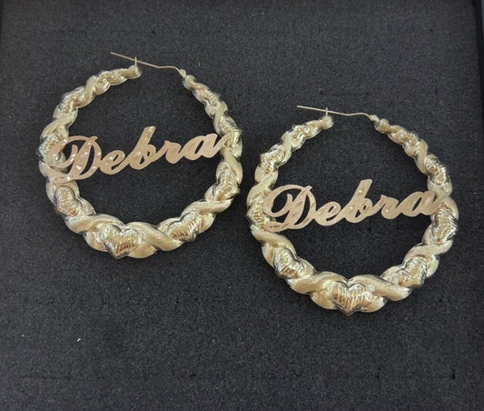 10k Heart Bamboo Style Hoop with Name, Big Gold Hearts Hoop, Gold Hoop Earring, Name Plate, Gold Name, Heart Style, Women's Hoops