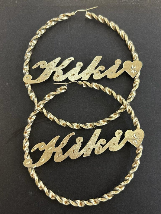 10k Twisted Hoop with Name, Big Gold Hoop, Twisted Gold Hoop Earring, Name Plate, Gold Name, Diamond Cut Finish, Heart Style, Women's Hoops