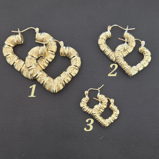 10k Yellow Gold Bamboo Rectangle with Heart Design Hoops, Trapeziod Bamboo Hoops, Triangle Hoops, Chunky Hoops, Clip on earrings, Love Hoop