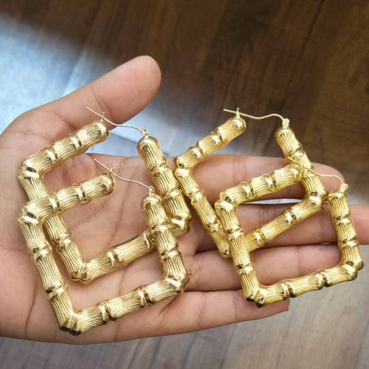 10k Gold Square Bamboo Style Hoops, Big Hoops for Women, Medium Hoops for Teenagers, Gold Bamboo Hoop Earrings, Rhombus Shape Hoops