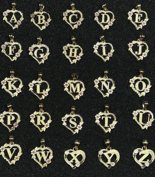10k Gold Heart with Pink Flowers Initial Pendant, Heart Letter Pendant, Rose Gold Flower, Gold Letter Charm, Alphabet Name Initial Pendant