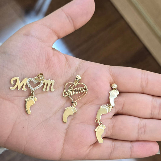 10k Gold Mom Pendant, Mom Heart Gold Charm, Dije de oro para Mama de Corazon, 10k Gold Baby Feet Charm,