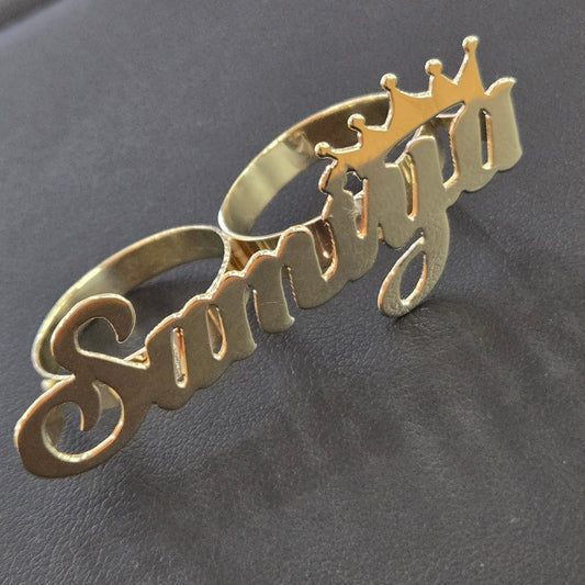 10k Gold Custom Two Finger Name Ring, Double Name Ring, Crown Name Ring, Birthday Gift Ring, Royalty Gold Ring, Queen Kimd Crown Ring