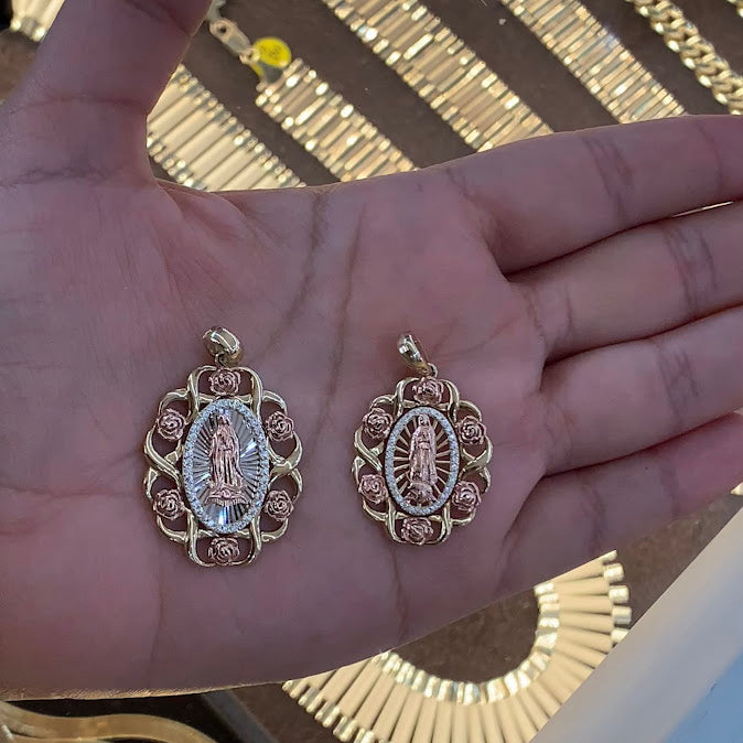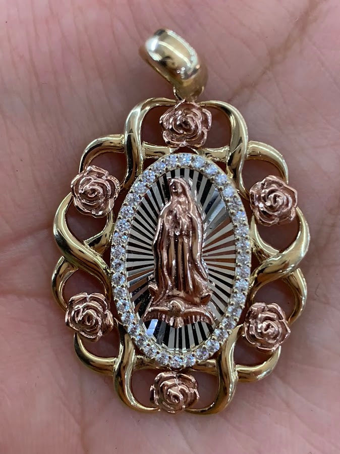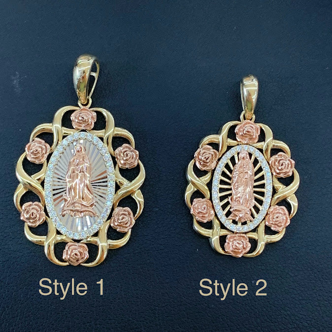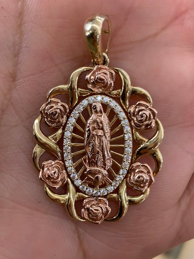 14k Gold Virgin Mary Pendant with Roses , Mary Pendant, Gold Oval Virgin Mary Charm, Religious Gold Pendants, Yellow White , Rose Gold with CZ Stones